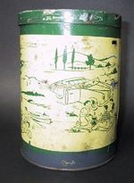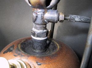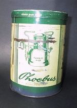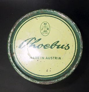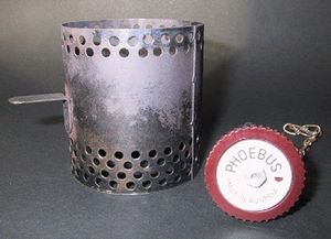 1950年代に製造された物である。右上の写真のように燃料タンクへのバーナー・ヘッドの取り付けは六角ボルトで行っている。これが旧旧型の特徴である。また黄色のネーム・シールはまだ付いておらず、燃料タンクに直接「ORIGINAL-PHOEBUS、No.625、MADE IN AUSTRIA」と刻印されている。風防はステンレス製で黒染め処理がしてあり、火力調整ハンドルの銘板は「PHOEBUS、MADE IN AUSTRIA」とだけ記されている。 収納缶は丸形でキャンプやドライブのイラストが描かれている。 写真の物は、かなり古い物ではあるがパッキン類を交換した結果、今でも使用可能である。 |