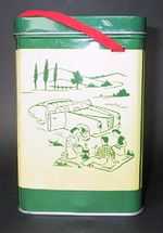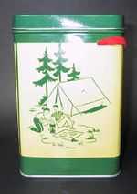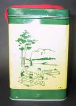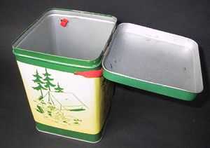 収納缶は角形で、四面のイラストは丸缶と同じ物が描かれている。フタがヒンジで開け閉めでき、当時の手間を掛けた造りが良く分かる。