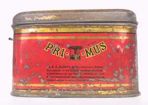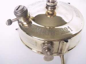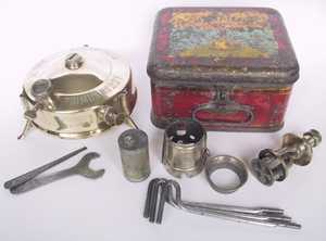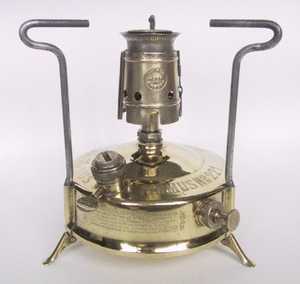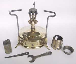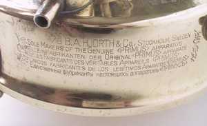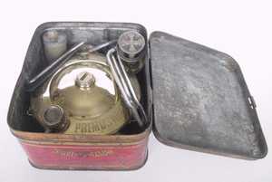 登山・キャンプ用として良く使われたNo.210のタンク容量を2倍にしたモデル。このモデルは日本には輸入されていなかったと思われる。下の写真の品はタンク底面にWの刻印があり、1931年に製造されたことを示している。風防は2枚に分割できる構造になっている。また三脚上面にはタガネによって打たれた滑り止め加工がしてあり、共にこの当時の手を掛けた造りが良く分かる。ケース背面には家庭用のレンジ(No.521か?)の絵が描かれている。 |